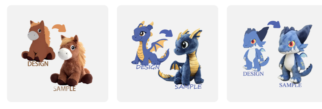 Von einem vagen Konzept bis hin zu einem detaillierten Design – unser professioneller Anpassungsservice kann es von einer virtuellen Fantasie in einen echten, anschmiegsamen Begleiter verwandeln.